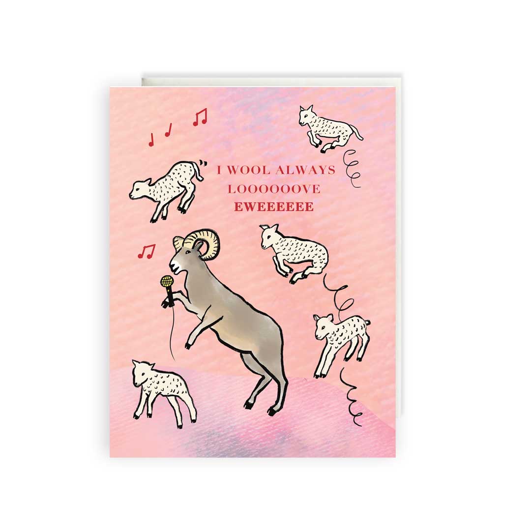 I Wool Always Love Ewe Valentine’s Card – The ram belts out the words “I wool always loooooove eweeeee” à la Whitney Houston. The lambs prance around with excitement in the background.
